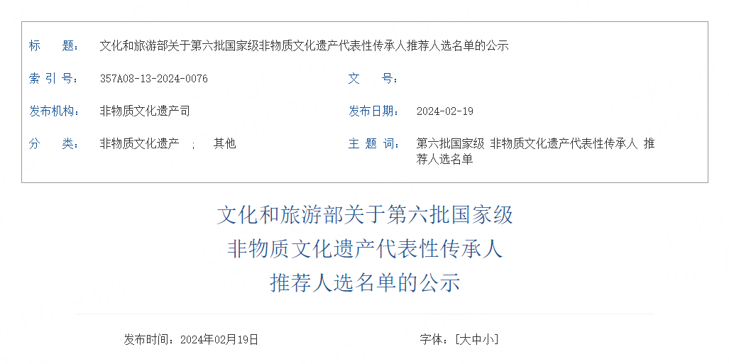 文化和旅游部關(guān)于第六批國家級非物質(zhì)文化遺產(chǎn)代表性傳承人推薦人選名單的公示