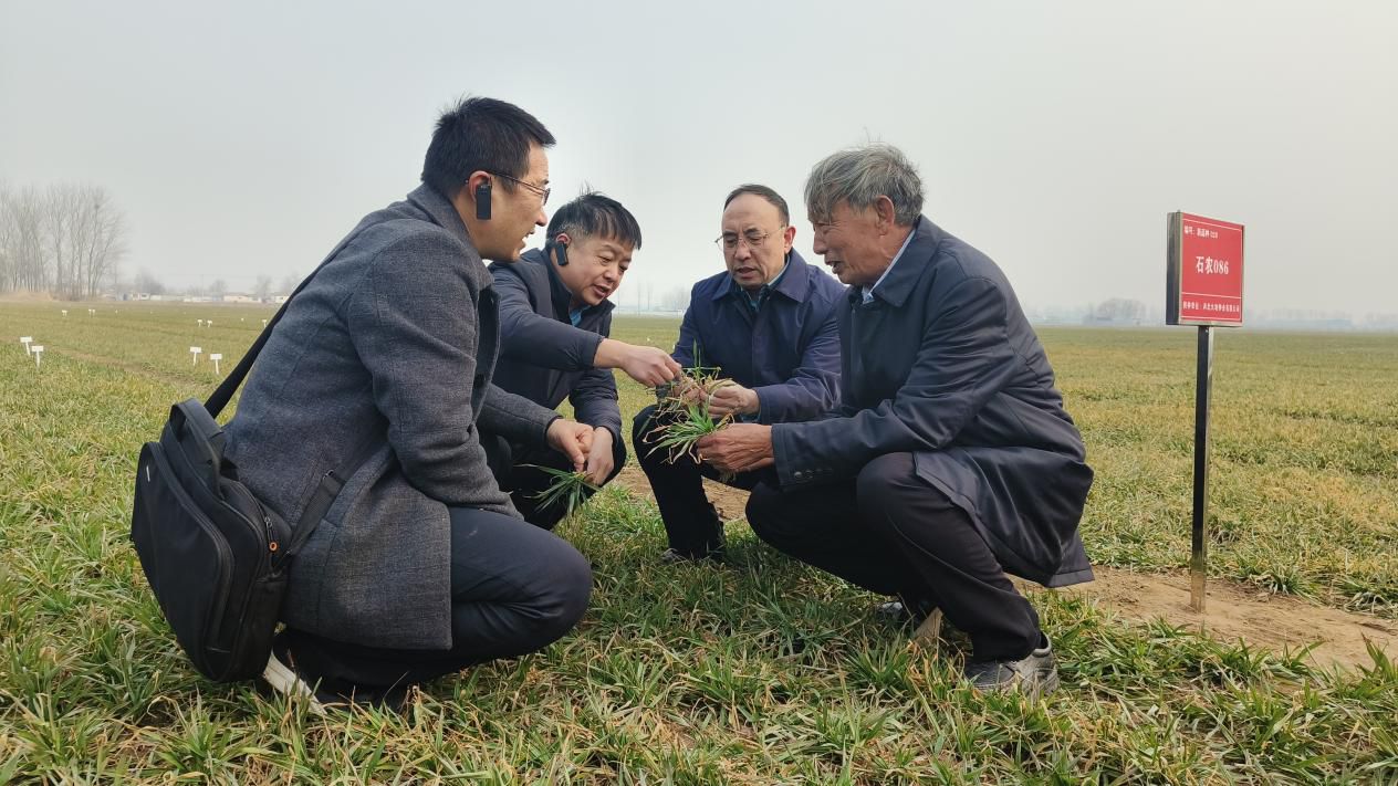 在辛集市馬蘭農(nóng)場的麥田里,河北省小麥專家指導(dǎo)組組長郭進(jìn)考正跟與會(huì)專家一起查看苗情!半m然冬季溫度偏低,但降雪覆蓋,未造成凍害。當(dāng)前小麥主體麥田的特點(diǎn)是:墑情足、凍害輕、群體足、個(gè)體壯!惫M(jìn)考介紹。