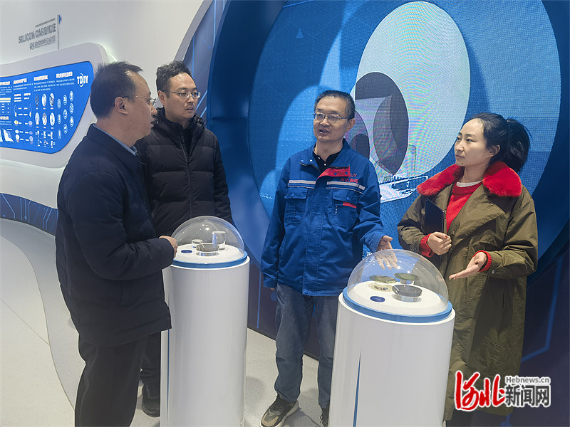 2月26日,在河北天達(dá)晶陽(yáng)半導(dǎo)體技術(shù)股份有限公司展廳內(nèi),邢臺(tái)市、清河縣相關(guān)部門工作人員(左二、左一)調(diào)研了解6英寸碳化硅晶片的制作工藝及應(yīng)用領(lǐng)域。 河北日?qǐng)?bào)記者 張偉亞攝