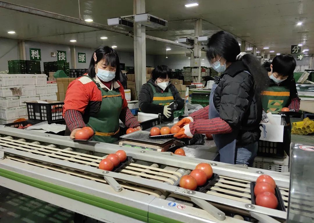 2月4日立春這天的上午,河北省廊坊市固安縣順齋瓜菜種植專業(yè)合作社的大棚里,社員們忙著采收。而在園區(qū)的產(chǎn)地集配中心里,工人們把剛從大棚里摘下的西紅柿進(jìn)行篩選分揀,再放到裹膜機(jī)的傳送帶上,自動(dòng)包裝后,貼上京客隆超市“隆之鮮”的標(biāo)簽。合作社理事長(zhǎng)張順齋說(shuō):“我們跟北京京客隆、呷哺呷哺、盒馬鮮生等合作,實(shí)行訂單生產(chǎn)、定向銷售。你像這個(gè)西紅柿就是我們昨天下午接到的訂單,今天早晨開(kāi)始采摘,完了包裝貼上標(biāo)簽,馬上配送到京客隆超市,我們力爭(zhēng)從田間到咱們市民的餐桌不超24小時(shí)。”