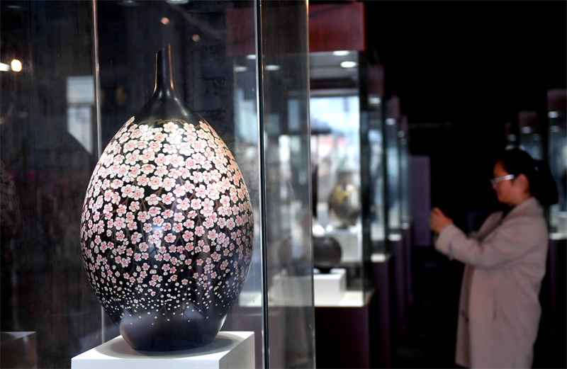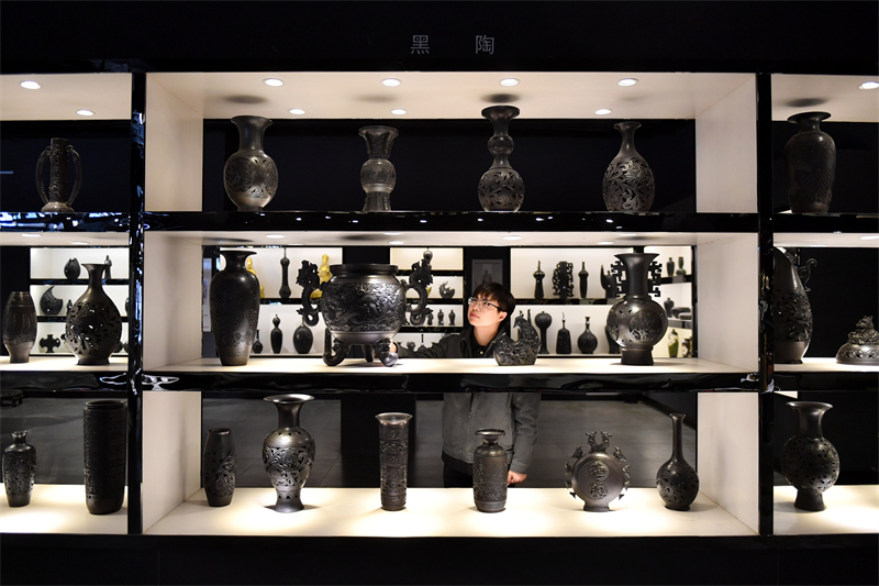 3月8日,在館陶縣一家陶藝漆藝藝術(shù)館,參觀者在欣賞黑陶產(chǎn)品。新華社記者 王曉 攝