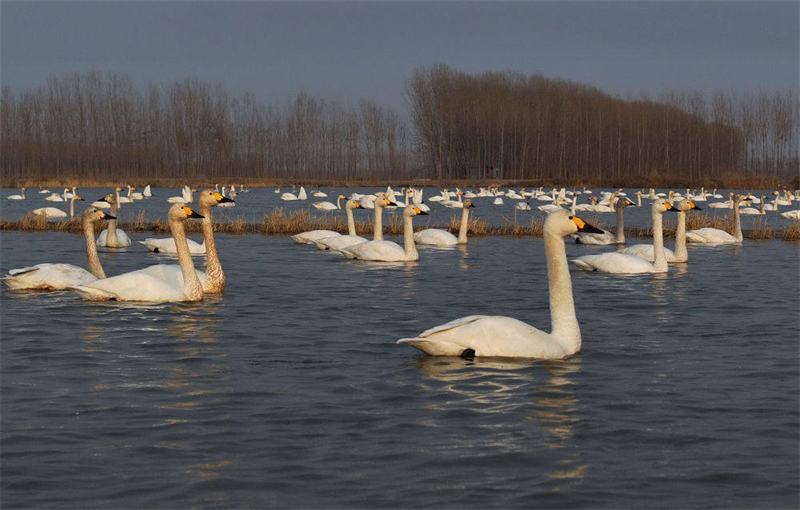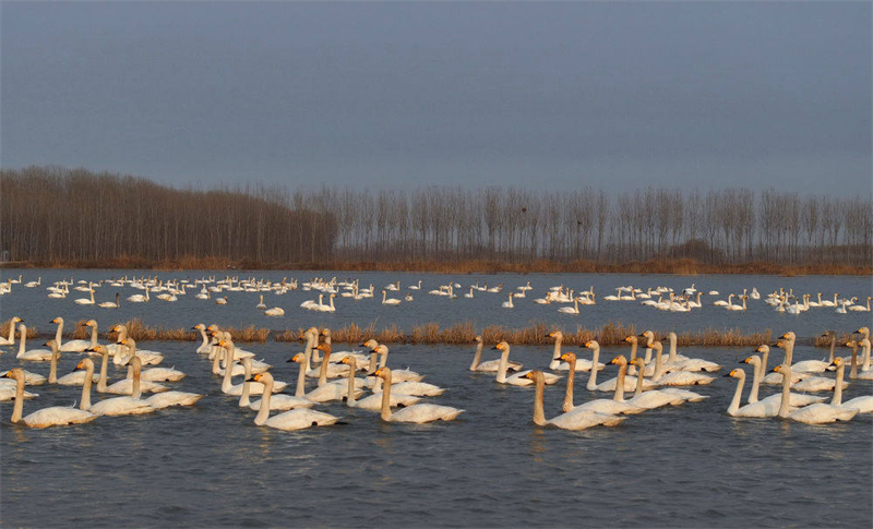 近日,大批天鵝飛臨河北省唐山市曹妃甸區(qū)境內(nèi)的濕地棲息、覓食。近年來,當(dāng)?shù)夭粩嗉哟笊鷳B(tài)保護(hù)力度,持續(xù)推進(jìn)濕地生態(tài)治理,有效改善了當(dāng)?shù)厣鷳B(tài)環(huán)境,每年都會(huì)吸引大批南北遷徙的候鳥駐足棲息。新華社記者 楊世堯 攝