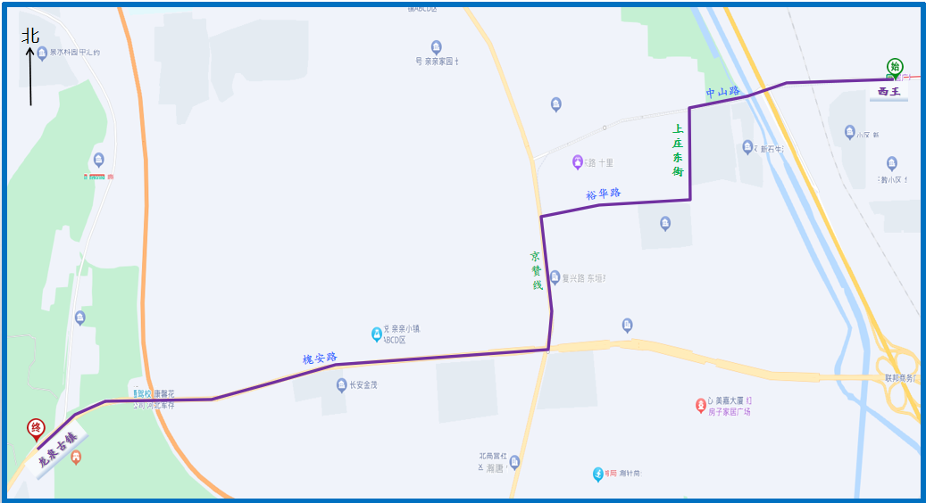 3.站位設(shè)置:西王、華柴、上莊東街北口、新新家園、凱旋門、上莊鎮(zhèn)衛(wèi)生院、上莊槐安路口、陸院南門、省建研院、省二院鹿泉院區(qū)、龍泉古鎮(zhèn)。