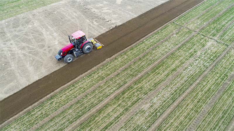 3月16日,在河北省唐山市豐潤(rùn)區(qū)小張各莊鎮(zhèn)南坨村,農(nóng)民駕駛農(nóng)機(jī)翻耕土地準(zhǔn)備播種地膜玉米(無(wú)人機(jī)照片)。
