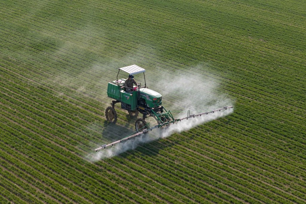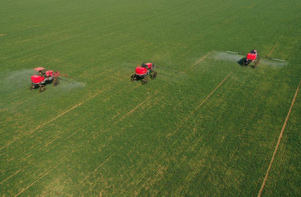 3月12日,在河北省邢臺市內(nèi)丘縣北陽村麥田,農(nóng)民駕駛自走式噴桿噴霧機(jī)噴灑除草劑(無人機(jī)照片)。新華社發(fā)(劉繼東攝)