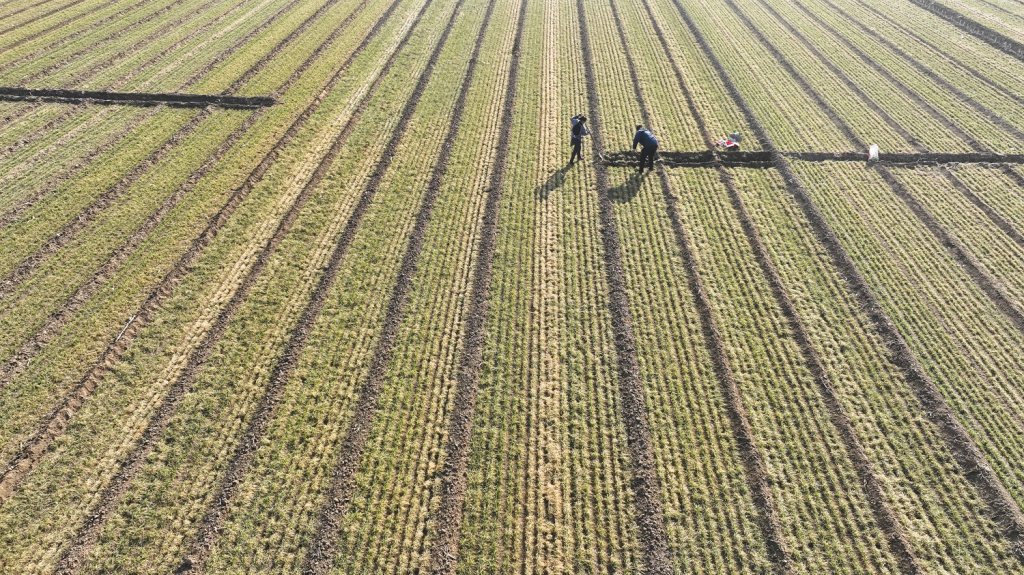 3月12日,河北省遵化市劉備寨鄉(xiāng)農(nóng)民在麥田修水渠,為春灌做準(zhǔn)備(無人機(jī)照片)。新華社發(fā)(劉滿倉攝)