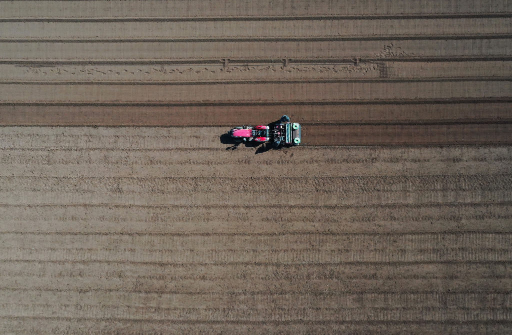 3月12日,河北省灤州市油榨鎮(zhèn)的農(nóng)民在田間使用播種機(jī)種植豌豆(無人機(jī)照片)。新華社記者楊世堯攝