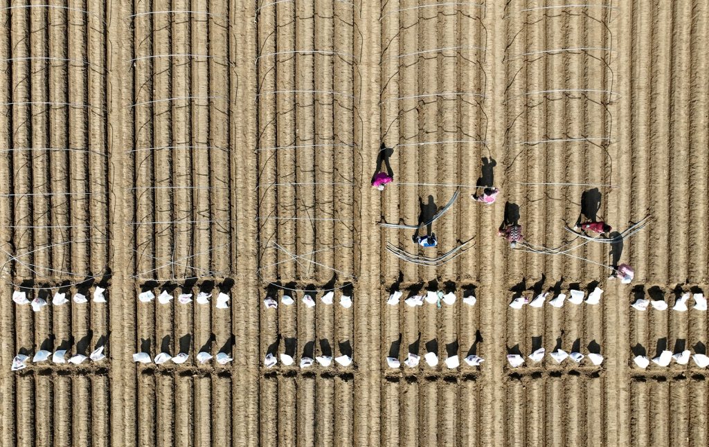 3月12日,在河北省石家莊市行唐縣龍州鎮(zhèn)劉七里峰村,農(nóng)戶在搭建姜棚(無人機(jī)照片)。新華社發(fā)(梁子棟攝)