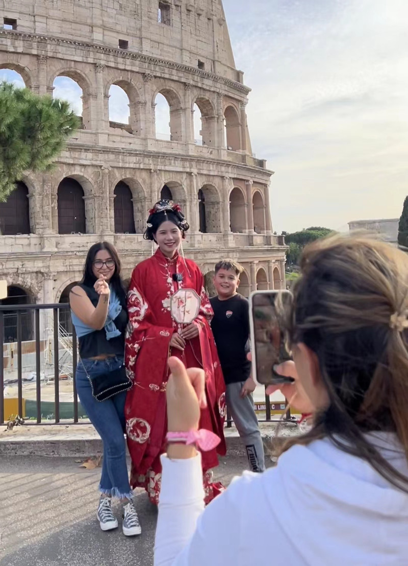 楊月身穿漢服在意大利羅馬,游客與她合照。(視頻截圖)