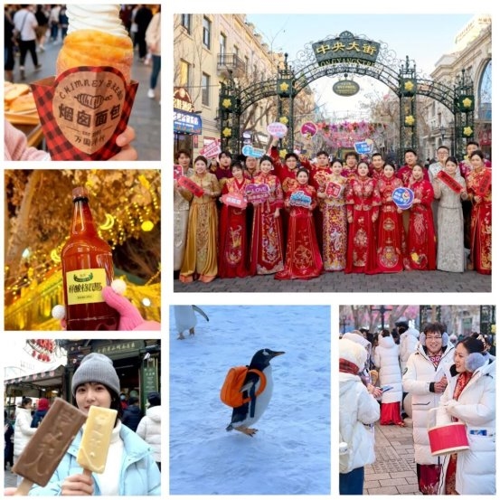 新人們可以牽手走過(guò)中央大街的石路,感受面包石在腳下的溫潤(rùn)觸感,左手攥著網(wǎng)紅煙囪面包冰淇淋,右手捏著馬迭爾雪糕,甜香直往鼻尖鉆,真恨不得當(dāng)場(chǎng)多長(zhǎng)兩只手,把更多快樂(lè)牢牢抓在手里;在索菲亞教堂前合影,看雪花繞著綠色穹頂跳舞,仿佛給百年建筑戴上了白絨帽;還能偶遇極地公園的“逃學(xué)企鵝”巡游,圓滾滾的小家伙們搖搖擺擺走過(guò),瞬間讓婚禮多了份童趣驚喜。要是想體驗(yàn)刺激,120米高的大雪花摩天輪正等著新人登頂,俯瞰全城銀裝素裹的盛景。