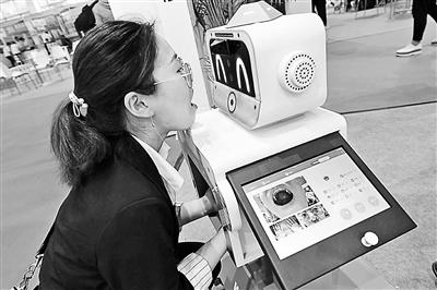 一位觀眾在體驗(yàn)幼兒園“晨檢”機(jī)器人攝影/本報(bào)記者林輝