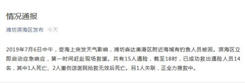 據(jù)山東省濰坊市濱海區(qū)信息網(wǎng)絡(luò)管理中心微信消息,7月6日中午,受海上突發(fā)天氣影響,濰坊森達(dá)美港區(qū)附近海域有釣魚人員被困,共15人遇險(xiǎn)。截至18時(shí),已成功救出遇險(xiǎn)人員14名,其中1人死亡、2人重傷送醫(yī)院搶救無效后死亡。另1人失聯(lián),正全力搜救中。