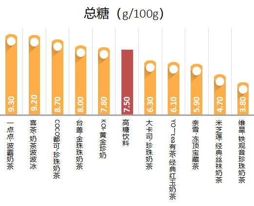 本次測評的10款珍珠奶茶中,5款屬于高糖飲料,其中一點點波霸奶茶總糖含量最高(9.30g/100g),維星鐵觀音珍珠奶茶總糖含量最低(3.8g/100g)。