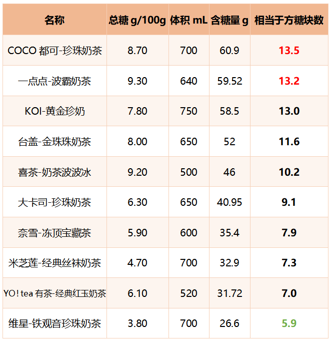 按每款茶的總體積算出它們各自的總糖值,10款珍珠奶茶每杯總糖值范圍為:26.6g~60.9g。以每塊方糖4.5g計算,一點點波霸奶茶單位總糖含量最高,每杯總糖量約為13.2塊方糖量。維星鐵觀音珍珠奶茶單位總糖含量最低,每杯總糖量約為5.9塊方糖量。