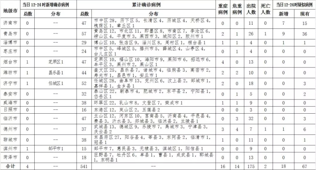 山東新增4例累計確診541例,新增疑似病例18例