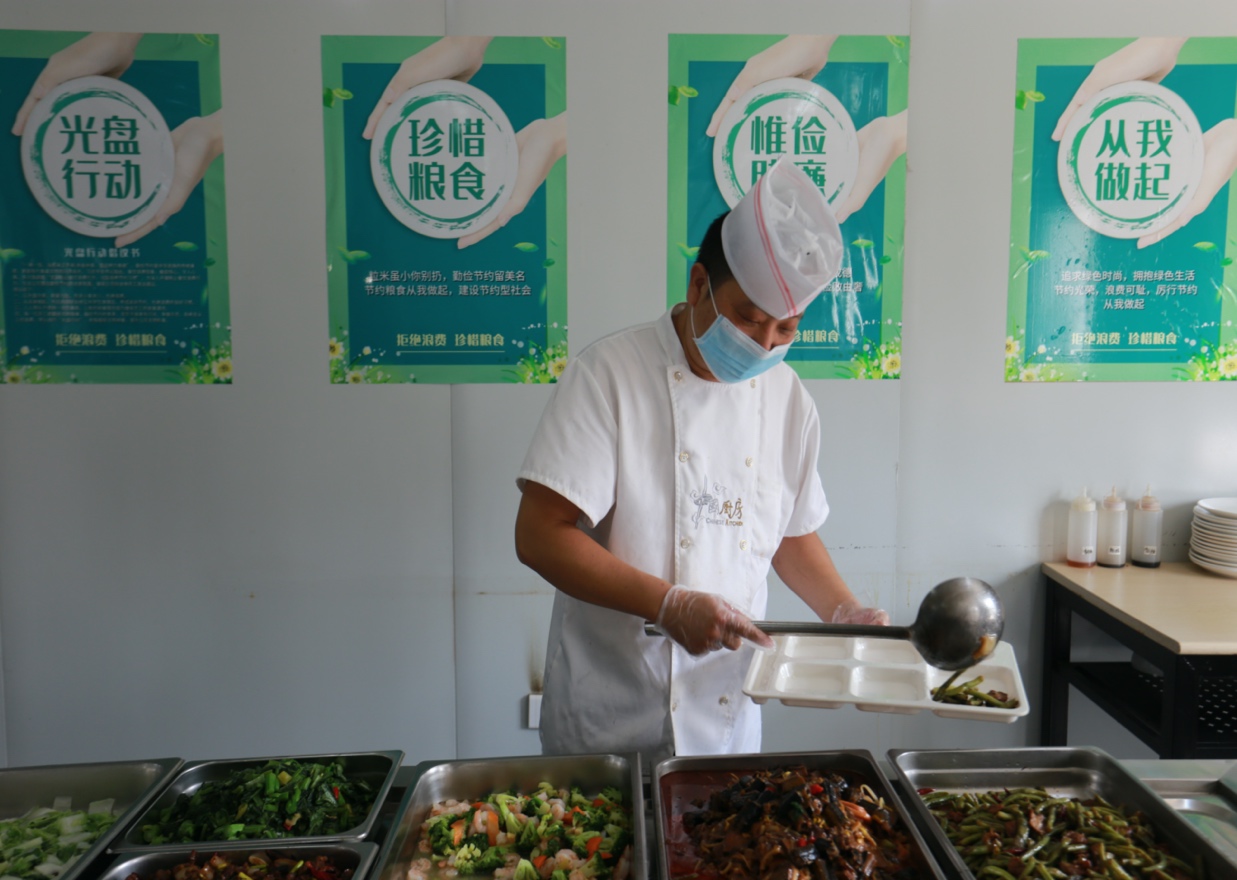 在疫情防控常態(tài)化背景下,為提高項目餐廳服務質量,有效避免餐品浪費,中建三局一公司北方公司對餐廳管理進行優(yōu)化調整,在取餐處懸掛文明用餐標語,時刻提醒就餐人員珍惜糧食、勤拿少取,就餐員工按照自身需求取餐,有效減少糧食浪費。