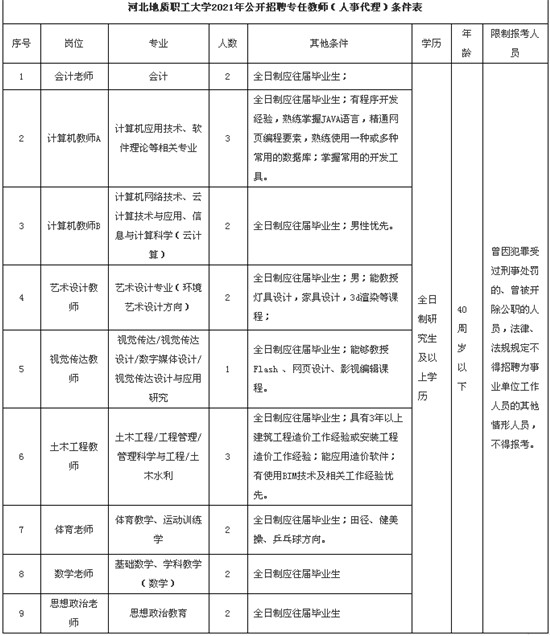 河北地質(zhì)職工大學(xué)2021年公開(kāi)招聘專任教師(人事代理)崗位招聘公告