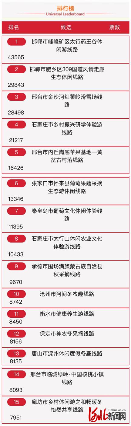 為期5天的網(wǎng)絡(luò)票選,總投票數(shù)超過25萬,其中,邯鄲市峰峰礦區(qū)太行藥王谷休閑游線路以43565票高居榜首。趁陽光正好、趁微風(fēng)不躁,快跟隨小編的腳步一起來打卡這15條精品線路吧!
