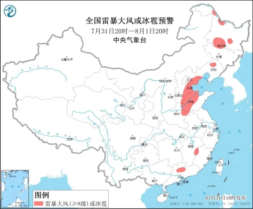 預計7月31日20時至8月1日20時,黑龍江中西部、河北中東部、天津、山東中西部、河南東北部等地的部分地區(qū)將有8-10級雷暴大風或冰雹天氣;內蒙古東部、黑龍江中西部、吉林東部和西部、遼寧中西部、河北中東部、北京東部、天津、山東、河南東北部、江蘇南部、上海、江西東北部、浙江、福建、云南、廣西、廣東、海南島東北部、臺灣島南部等地的部分地區(qū)將有短時強降水天氣,小時雨量30-50毫米,局地可達80毫米以上。