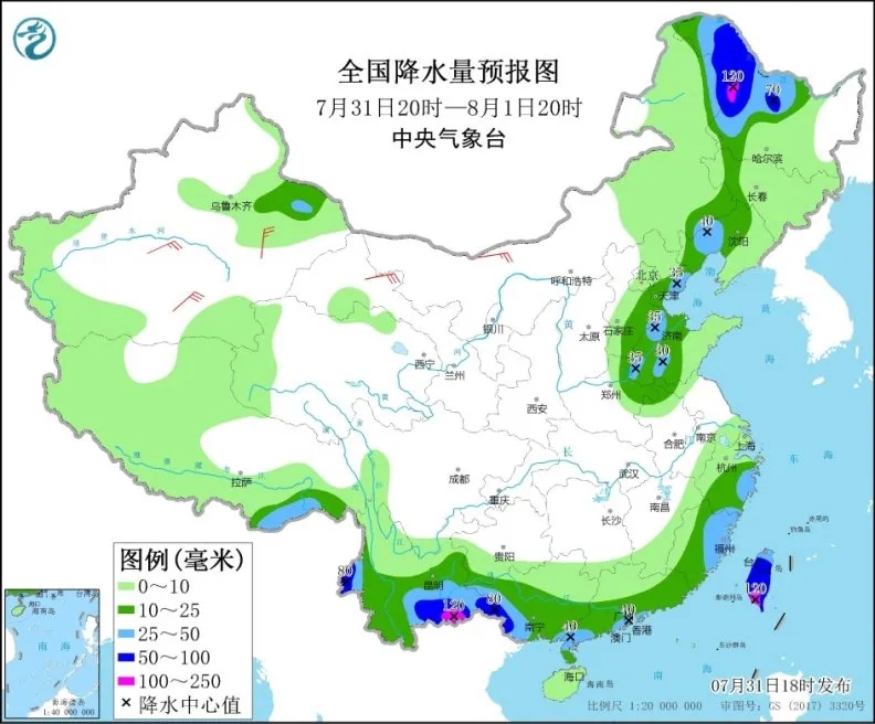 預計,7月31日20時至8月1日20時,內蒙古東北部、黑龍江中西部、遼寧西部、河北東北部、山東西部以及云南西部和東南部、廣西西南部、廣東中西部沿海、福建東北部、浙江中南部沿海、臺灣島等地的部分地區(qū)有大雨或暴雨,其中,內蒙古東北部、黑龍江西部、云南東南部、臺灣島南部等地局地有大暴雨(100~120毫米);上述大部地區(qū)伴有短時強降水(最大小時降雨量30~50毫米,局地可超過80毫米),局地有雷暴大風等強對流天氣。
