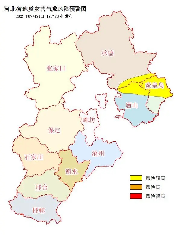 自07月31日20:00至08月01日20:00,河北省唐山市(遷西縣、遵化市、遷安市)、承德市(寬城、興隆縣)、秦皇島市(盧龍縣、山海關區(qū)、青龍、撫寧區(qū)、海港區(qū))發(fā)生崩塌、滑坡、泥石流等地質災害風險較高(黃色預警)。請上述地區(qū)有關責任單位和監(jiān)測人員做好地質災害監(jiān)測、巡查等防范工作。