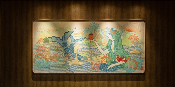 墻上的藝術(shù)畫同樣講述著咖啡與城市文化的融合,設(shè)計(jì)師別具匠心的將石家莊傳統(tǒng)剪紙藝術(shù)融入壁畫創(chuàng)作中,吸引著顧客,以青綠山水畫卷的形式展現(xiàn)的“山水星旅”壁畫里,美人魚手捧一杯臻選咖啡游弋在石家莊正定古城等地標(biāo)建筑剪影中,細(xì)細(xì)觀察,精致的剪紙藝術(shù)使得整幅壁畫更加立體。另一幅作品則是設(shè)計(jì)感十足的立體“石家莊”變形文字和臻選豆卡的藝術(shù)組合。在匠心設(shè)計(jì)的星巴克第三空間,令顧客在品嘗一杯高品質(zhì)臻選咖啡的同時(shí),感受不同文化相融合的美。