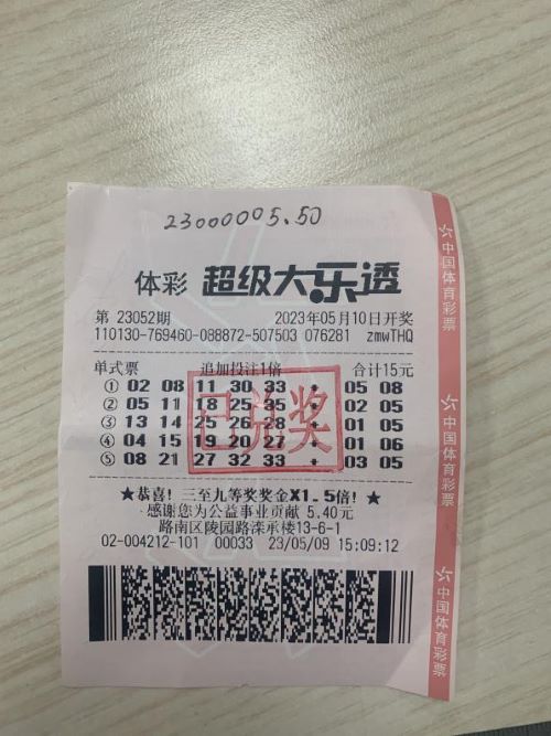 5月10日,體彩超級(jí)大樂(lè)透迎來(lái)“10億元大派獎(jiǎng)”的第14期開(kāi)獎(jiǎng)——第23052期前區(qū)開(kāi)出號(hào)碼“02、08、11、30、33”,后區(qū)開(kāi)出號(hào)碼“05、08”。本期全國(guó)銷(xiāo)量為3.55億元,為國(guó)家籌集彩票公益金1.28億元。本期全國(guó)共中出5注一等獎(jiǎng)。其中3注符合本次派獎(jiǎng)參與條件,分享了本期1500萬(wàn)元一等獎(jiǎng)派獎(jiǎng)獎(jiǎng)金,分享派獎(jiǎng)獎(jiǎng)金后單注總獎(jiǎng)金為2299萬(wàn)余元(含800萬(wàn)元追加獎(jiǎng)金+499萬(wàn)余元派獎(jiǎng)獎(jiǎng)金),其中一注由位于河北省唐山市路南區(qū)陵園路灤承樓的1302004212101號(hào)代銷(xiāo)網(wǎng)點(diǎn)中得。
