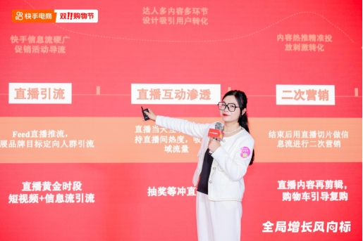 快手商業(yè)化短視頻家百綜合負(fù)責(zé)人尹松分享了《短視頻帶貨模式的打法及雙11政策解析》,目前有越來越多商家開始嘗試“短+直”雙開的經(jīng)營(yíng)模式,即以直播間為售賣載體,用短視頻引流到直播間成交的模式,由此拓展了新的生意機(jī)會(huì)。
