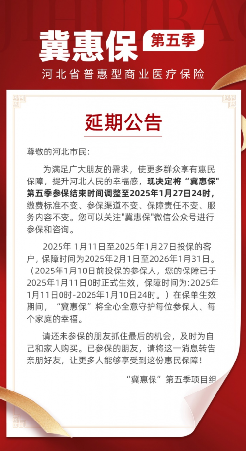 為滿(mǎn)足廣大河北市民對(duì)普惠型商業(yè)醫(yī)療保險(xiǎn)的需求,進(jìn)一步提升民眾的幸福感,“冀惠保”項(xiàng)目組決定,將“冀惠保”第五季的參保結(jié)束時(shí)間延長(zhǎng)至2025年1月27日24時(shí)。在此期間,保費(fèi)標(biāo)準(zhǔn)、參保渠道、保障責(zé)任及服務(wù)內(nèi)容均保持不變。
