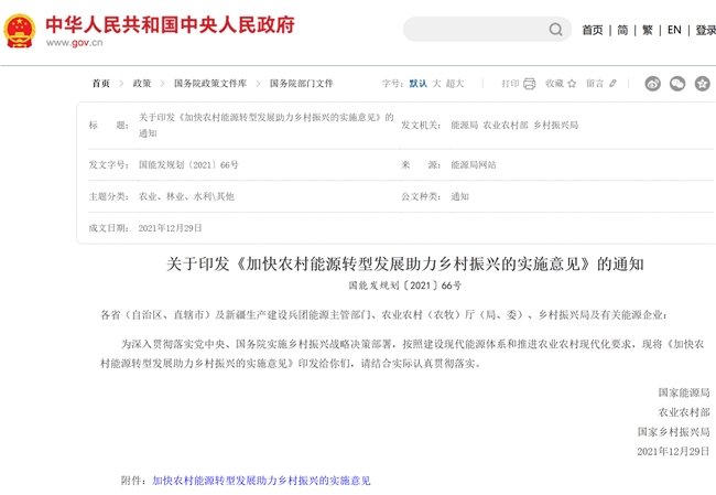 在“雙碳”戰(zhàn)略目標引領(lǐng)下,我國農(nóng)村正開啟一場前所未有的能源革命。2021年12月29日發(fā)布的《加快農(nóng)村能源轉(zhuǎn)型發(fā)展助力鄉(xiāng)村振興的實施意見》,為這場變革指明了方向:到2025年建成綠色低碳試點,形成多元互補的能源體系。