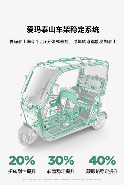 同時,愛瑪樂臻CA900采用泰山車架平臺,高碳鋼材質搭配分段式沖壓工藝,369kg超負荷震動實驗60萬次不變形;900mm超寬后輪距降低重心,38°側傾臨界角大幅提升防側翻能力,轉彎平穩(wěn)無顛簸。