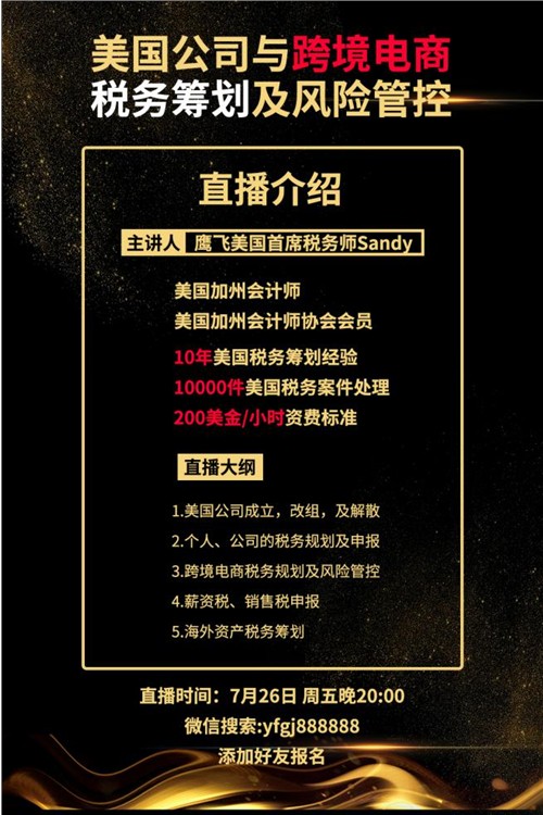 是的,7月26日(本周五)北京時間晚8點,鷹飛國際金牌稅務師Sandy為各位對美國稅務感興趣的朋友進行現場直播啦!