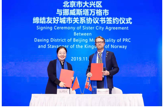 2019中國(guó)設(shè)計(jì)節(jié)的開幕式上,挪威斯塔萬(wàn)格市代表約翰·彼得·赫恩先生和北京市大興區(qū)人民政府副區(qū)長(zhǎng)楊蓓蓓女士共同簽署友城協(xié)議,大興區(qū)與斯塔萬(wàn)格市正式締結(jié)友好城市。
