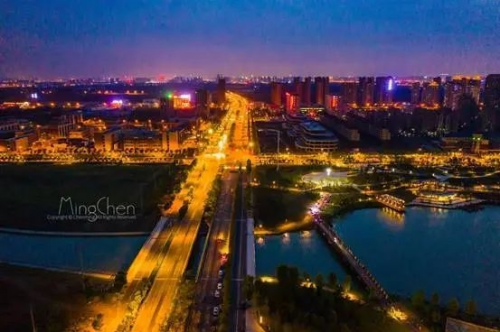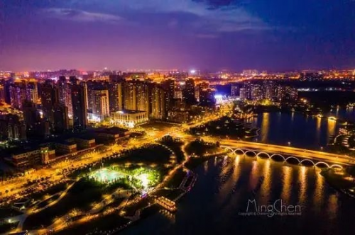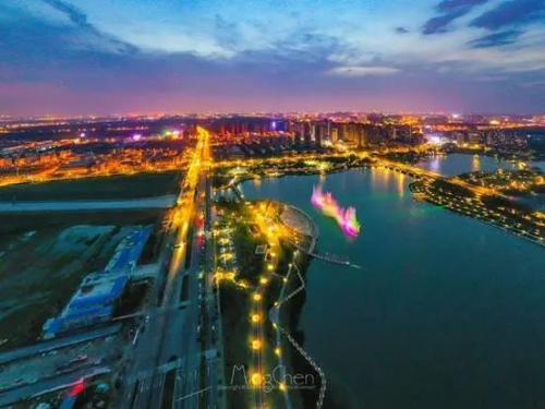 用航拍小飛機(jī)升空后,俯瞰和睦湖全景。夕陽西下,遠(yuǎn)處高樓燈光和街道照明連接成片,一副現(xiàn)代化都市夜景面貌表露無遺。