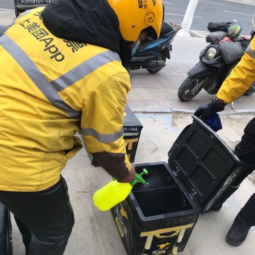 (石家莊騎手正在使用消毒液對(duì)配送箱進(jìn)行消毒)