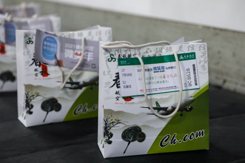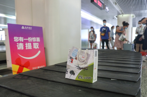7月16日下午,搭乘春秋航空9C8628桂林飛往石家莊航班的旅客像往常一樣下飛機,來到托運行李轉盤處等待自己的行李到達。與往常不同的是,旅客們欣喜的發(fā)現(xiàn)行李轉盤上除了自己的托運行李,還出現(xiàn)了一件件“神秘行李”,每件“神秘行李”的袋子上還附有一張小卡片——“親愛的9C8628航班旅客們,我們?yōu)槟鷾蕚淞艘环菹娜斩Y品,快將它們帶回家!”