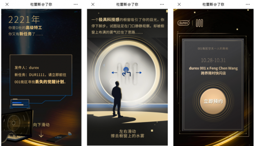 蕭瑟的10月尾聲,杜蕾斯以一支“沉浸式探案H5”激活了朋友圈的社交力。高級(jí)特工的人物設(shè)定搭配劇本殺式的游戲體驗(yàn),為消費(fèi)者們帶來(lái)了耳目一新互動(dòng)體驗(yàn),在通過(guò)重重懸疑關(guān)卡考驗(yàn)之后,一張來(lái)自杜蕾斯的黑金邀請(qǐng)函,揭開(kāi)了durex 001 × FengChenWang跨界聯(lián)名快閃店的神秘面紗。
