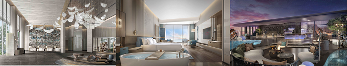 從左至右:酒店大堂效果圖,海景大床房效果圖,樓頂酒吧及戶外泳池效果圖