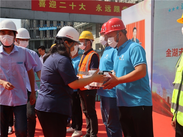 活動(dòng)中,劉曉昕為現(xiàn)場項(xiàng)目管理人員發(fā)放了黨史書籍,并為現(xiàn)場農(nóng)民工工友發(fā)放了慰問品。