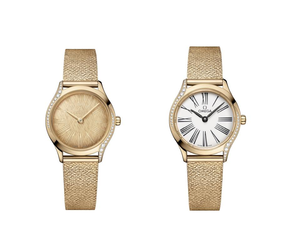 全新名典腕表包含兩款由Moonshine 18K金打造的腕表,閃耀迷人。其中一款腕表的表殼、表鏈、指針、小時刻度甚至飾有絲綢紋理的表盤均由歐米茄獨家研發(fā)的Moonshine 18K金制成,渾然一體。另一款則搭配由“大明火”工藝制成的米白色琺瑯表盤,飾以經黑化處理的羅馬數字刻度,對比鮮明。