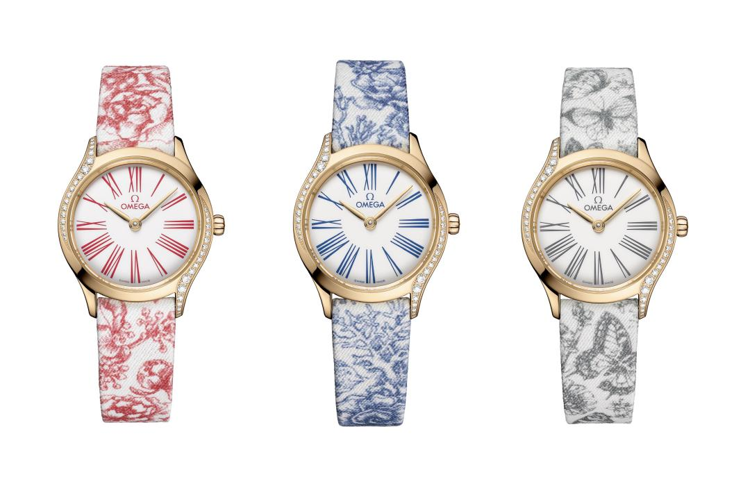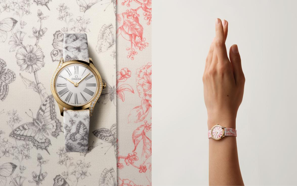 歐米茄從歷史上運用在壁毯和瓷器上的茹伊印花圖案中汲取靈感,設計并推出三款風格獨特的“茹伊印花”表帶,每一款表帶的圖案均與歐米茄品牌基因息息相關。其中,藍色海洋元素致敬歐米茄與深海探索的深厚情緣,黑色蝴蝶圖案象征著歐米茄支持人類航空航天探索的傳奇歷史,紅色花卉圖案則彰顯品牌對保護地球家園的不竭熱忱。