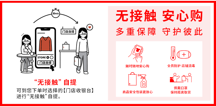 優(yōu)衣庫大繽紛舒適新春新品提前上市,挑選品質新衣,就是為自己和家人送上安心與活力!紅運新裝全家福系列,為全家鴻運添彩 健康團圓;趣味繽紛 兔年限定印花衛(wèi),穿出悅動元氣,新年大展宏“兔”;防風防雨高功能外套、高級輕羽絨等科技單品,披上勇氣與安心,新年勇敢探索新可能;多樣褲裝與時尚裙裝,邁出自信與出色,點亮絢麗新氣象;更有質感針織衫系列早春新品,煥新春日熱情洋溢。同時門店推出“無接觸 安心購”服務,不僅門店嚴格實行衛(wèi)生消毒,還可以在優(yōu)衣庫官網(wǎng)/掌上優(yōu)衣庫小程序下單選擇“無接觸”自提,不便到店時也可選擇“跑腿”代提;為親友送新衣,可選擇“同城下單 異地取貨”。還可于掌上優(yōu)衣庫購買優(yōu)衣庫心衣卡,一鍵輕松送心意。