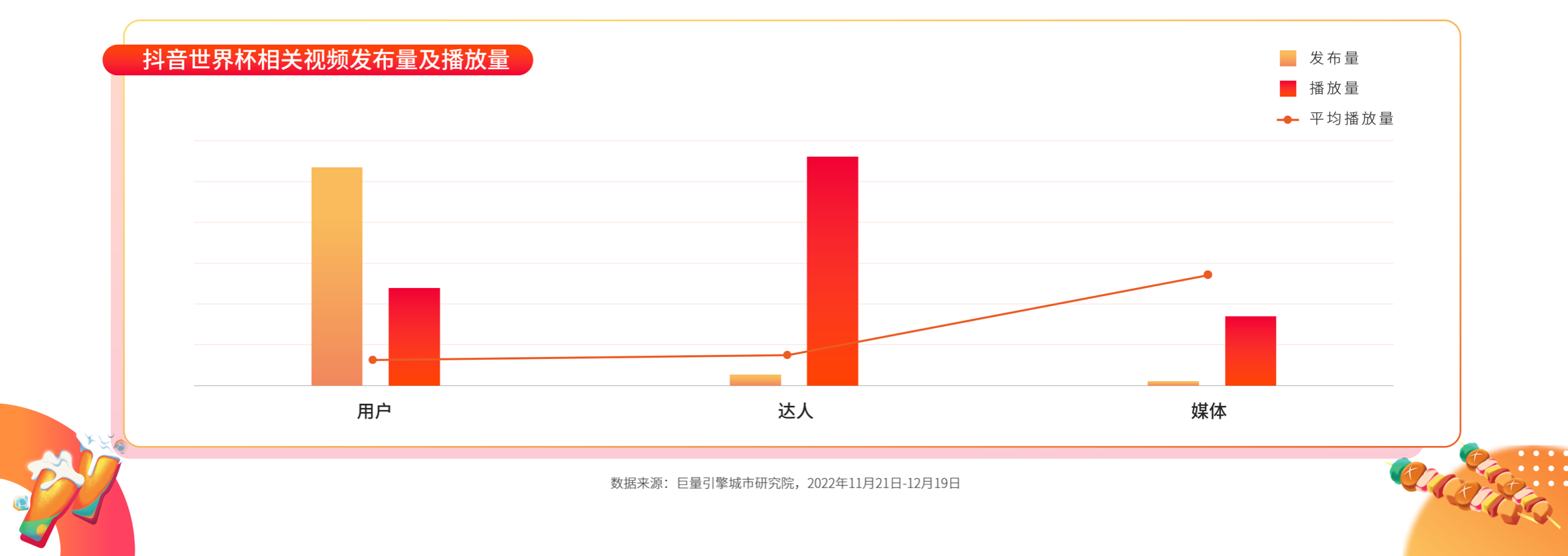 這場盛宴中,用戶、達人、媒體積極參與,盡情狂歡。用戶參與度高,發(fā)布視頻數(shù)量最多;達人視頻吸引力高,獲得的播放量最大;媒體發(fā)布的視頻,平均單條世界杯視頻帶來86萬播放,是抖音世界杯內(nèi)容生態(tài)的重要一環(huán)。