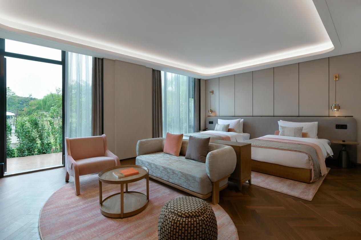 南京泊金花間堂·琵琶山居位于鐘山風(fēng)景區(qū),依山湖而建,取「隨遇而安因樹為屋,會(huì)心不遠(yuǎn)開門見(jiàn)山」的美好意念,將當(dāng)?shù)匚幕c南京的歷史底蘊(yùn)細(xì)藏于一磚一瓦,呼應(yīng)時(shí)下現(xiàn)代人們對(duì)生活返璞歸真的渴望和追求。酒店整體裝飾多選用青銅與旗袍服飾中墨綠、深灰的經(jīng)典顏色,詮釋了南京的人文風(fēng)情。雨花石的巧妙紋理延伸至華麗屏風(fēng)和艷麗掛飾上,宛若天上的五彩玉盤碎落撒至人間,繪成眼前的多彩金陵。酒店共有67間客房,融入傳統(tǒng)的云錦藝術(shù)背景,透過(guò)色彩氣氛的運(yùn)用,打造出墨綠低奢、砂粉文雅的格調(diào),為旅人構(gòu)筑聽(tīng)雨觀花的美好居所。無(wú)邊嬉水池、茴香餐廳、露天平臺(tái)、天然湖泊及以清代戲臺(tái)為靈感的暢音影音廳等配套設(shè)施一應(yīng)俱全。每位旅人,都能在自然之美與人文之情交匯中,重拾生活本真的雅趣。特別推薦親子度假、自然人文探索與攜寵出行客群前往體驗(yàn)。