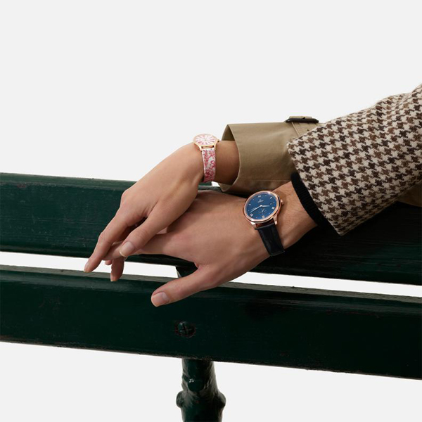 碟飛系列Mini名典腕表,腕表表殼采用Moonshine 18K金打造,搭配風(fēng)格獨(dú)特的紅色花卉“茹伊印花”織物表帶。腕表的表殼尺寸為26毫米,兩側(cè)鑲嵌有閃耀美鉆,自然延伸至表耳,呈現(xiàn)出迷人的曲線。表冠上的花朵圖案以紅色液態(tài)陶瓷打造,花蕊處鑲有一顆璀璨鉆石。拱形米白色琺瑯表盤(pán)采用“大明火”工藝制成,搭配Moonshine 18K金鉆石拋光指針和玫瑰紅羅馬數(shù)字刻度。這款雅致的碟飛系列Mini名典腕表的內(nèi)部搭載歐米茄4061機(jī)芯,拋光鏡面表背經(jīng)過(guò)金屬鍍膜處理,飾以“Her Time” (她的時(shí)光) 圖案。