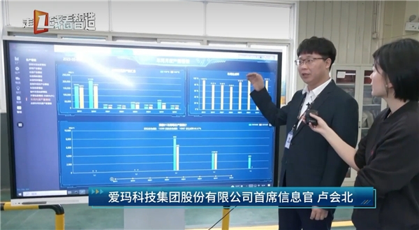圖:央視記者現(xiàn)場(chǎng)了解愛(ài)瑪信息化系統(tǒng)的信息看板