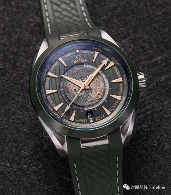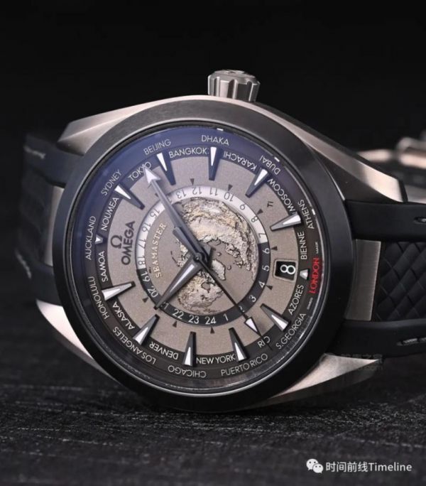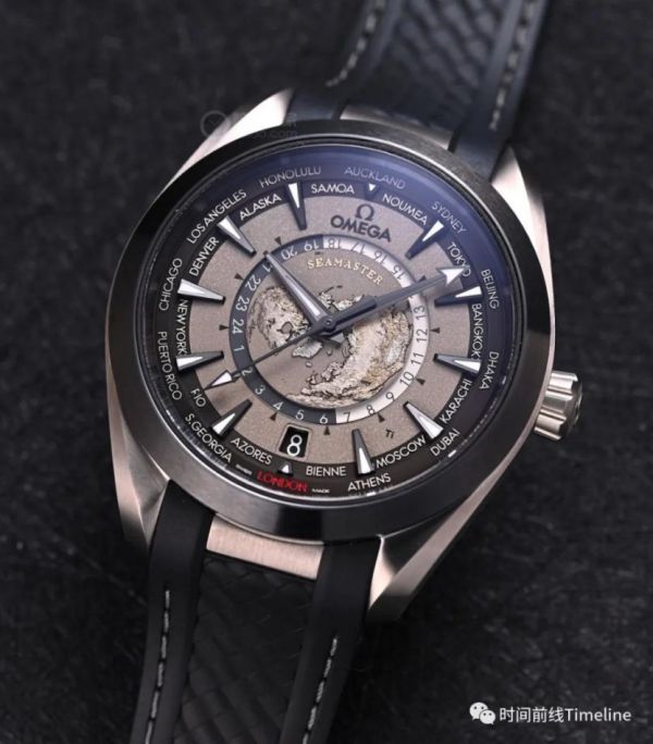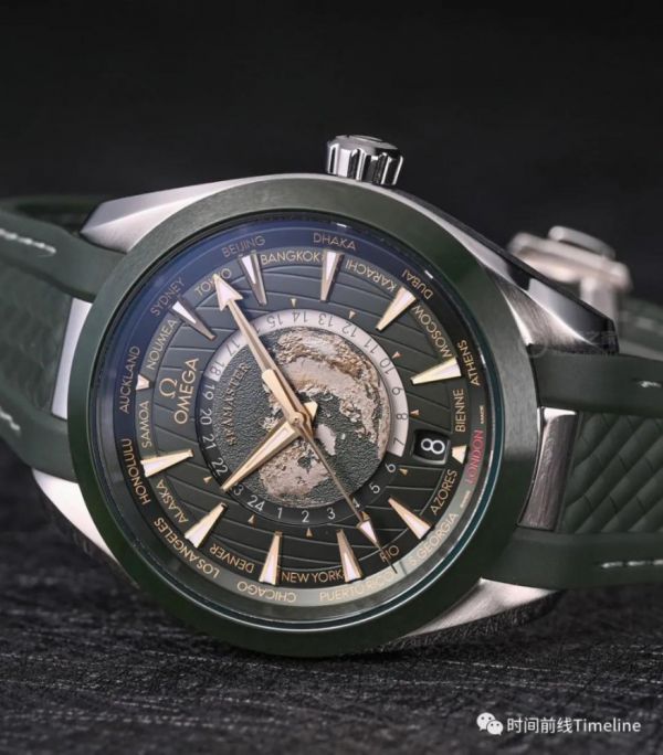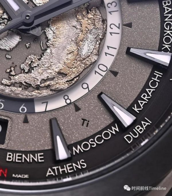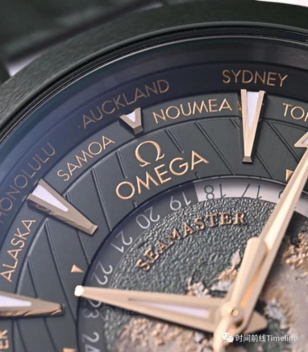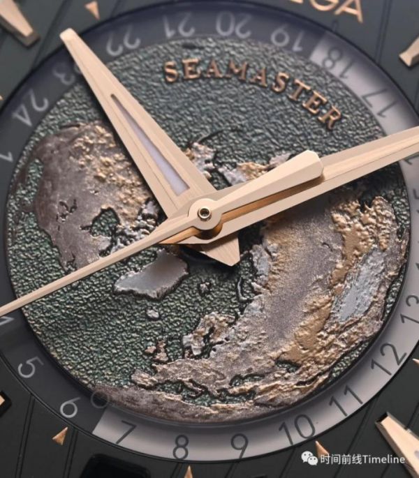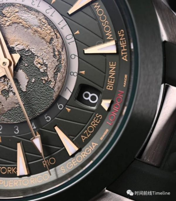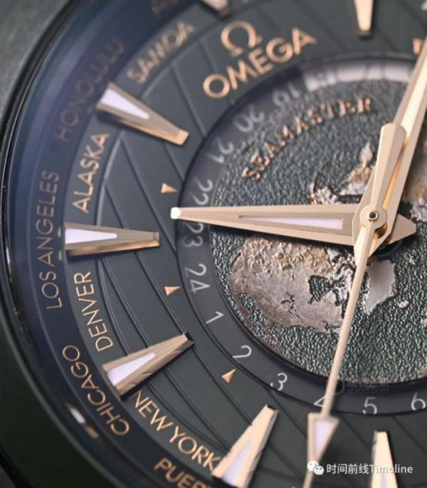 這款世界時(shí)的細(xì)節(jié)在于,內(nèi)表盤的海洋顏色與手表配色一致,鈦殼是灰色、鋼殼是綠色;陸地則采用激光技術(shù)進(jìn)行著色,金色是高海拔地區(qū)。其中鈦金屬表盤的黑灰色都是由激光歐米茄的地圖是以北極為中心的北半球,我們可以注意到,地圖帶有微微的弧形效果,模仿了真實(shí)的地球曲率。盤面上帶地圖的表不少,但像歐米茄做的這么細(xì)致真實(shí)的,極少。