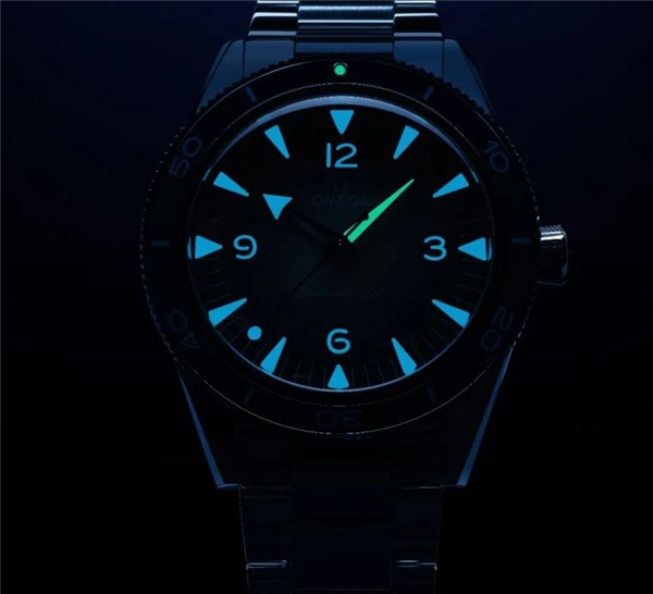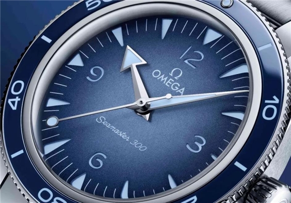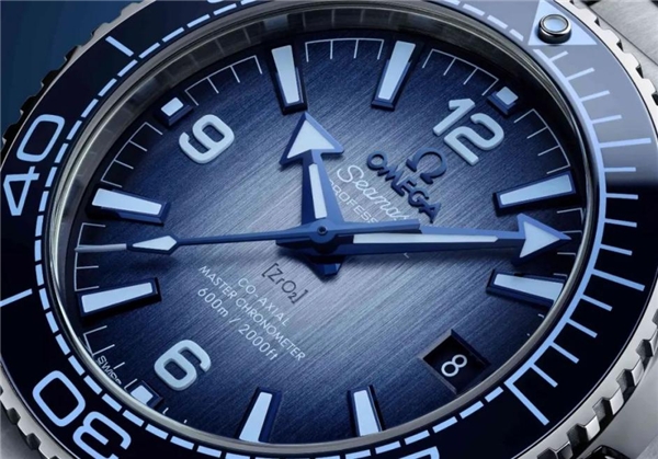 表殼外圈是藍色陶瓷,不易劃傷。陶瓷表盤經(jīng)PVD工藝處理,呈漸變效果,比海馬300的顏色更深一些。