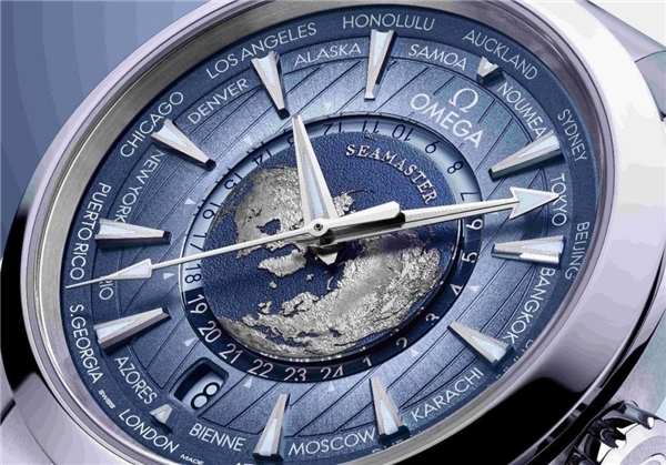 歐米茄海馬系列Aqua Terra世界時腕表,直徑43mm的精鋼表殼里,暗藏許多玄機。5級鈦金屬內(nèi)表盤上飾有精致的藍色海洋和激光燒蝕的各大洲浮雕地形圖,錯落有致、溝壑儼然。
