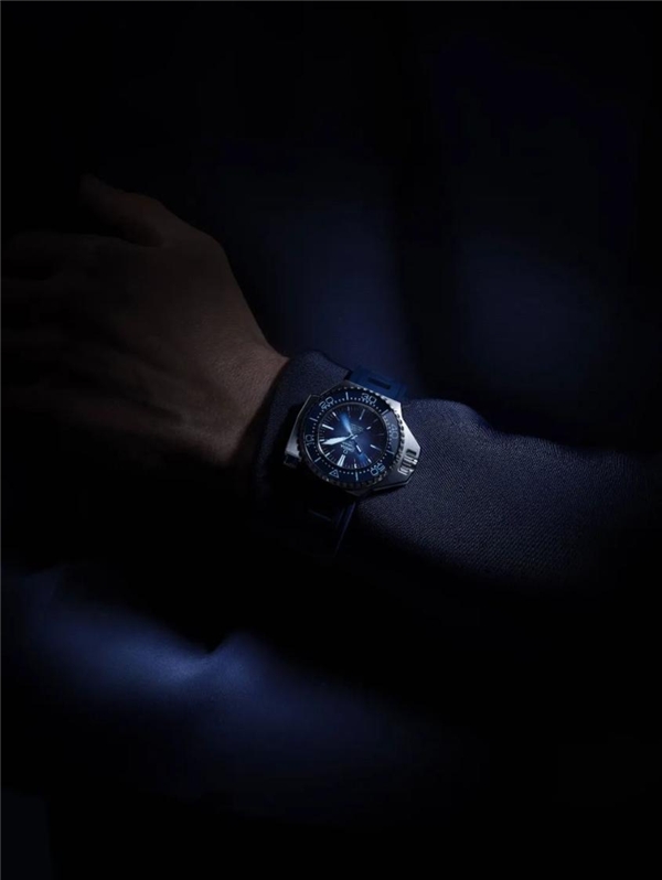 這枚腕表之經(jīng)典已經(jīng)不言而喻。黑暗環(huán)境中,藍色和綠色兩種夜光和諧搭配,分針和12點位可旋轉(zhuǎn)表圈的刻度點是綠色,方便記錄潛水時間;時針、秒針、刻度,都是藍色。關于一只潛水表的沉浸式體驗,如斯而已。